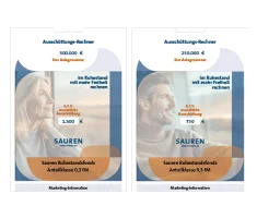 - Ausschüttungs-Rechner: Das Highlight – jetzt auch digital!- Mit dem Ausschüttungs-Rechner im vertrauten Alltagsformat lässt sich die monatliche Ausschüttung des Sauren Ruhestandsfonds 0,3FM praktisch "erleben". Er ist in zwei Varianten verfügbar und eignet sich als besondere vertriebliche Unterstützung, damit auch Ihre Kunden im Ruhestand ganz einfach mit mehr Freiheit rechnen können.