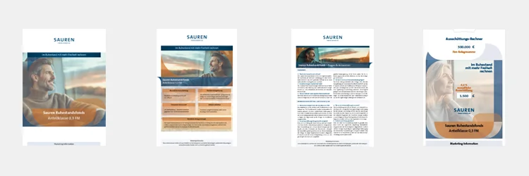- Zweiseiter: Die wichtigsten Informationen für Sie auf einen Blick- Die zweiseitige Broschüre richtet sich an Sie und bietet Ihnen die wichtigsten Kernargumente des Sauren Ruhestandsfonds 0,3 FM auf einen Blick. Ebenso steht Ihnen hier beispielhaft eine simulative Wertentwicklung zum Ruhestandsfonds zur Verfügung.